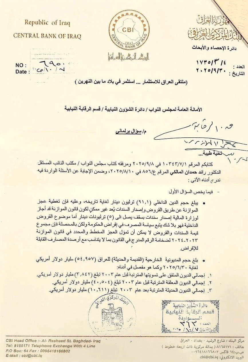 كشف البنك المركزي العراقي، عن إن مديونية العراق تبقى ضمن الحدود الآمنة ولا تشكل عبئاً على الاقتصاد الوطني. وذكر بيان تلقته (الزمان) أمس إنه (في إطار الشفافية المالية وتوضيحاً لما يرد في بيانات الدَين العام والعجز، يودُّ المركزي إيضاح ما ورد في وسائل الإعلام، أن العجز المخطط في قانون الموازنة العامة الثلاثية التي أقرها مجلس النواب للسنوات الثلاثية، بلغ بمقدار 91.5 تريليون دينار، في حين بلغ العجز الفعلي للسنوات الثلاث المذكورة مبلغ 35 تريليون دينار، تمت تغطيتها داخلياً بسندات وحوالات ووفقاً للأبواب الواردة في قانون الموازنة)، وأضاف إن (الاقتراض الفعلي بلغ نسبة 18,2 بالمئة من العجز المخطط الوارد في قانون الموازنة، وبما يعكس مستوى التنسيق العالي بين الحكومة والمركزي في السيطرة على الدين العام وعدم بلوغه المستويات العالية التي وردت في قانون الموازنة)، وتابع إن (الديون الخارجية الواجبة السداد لا تتجاوز 13 مليار دولار بعد استبعاد ديون النظام السابق المعلقة وغير المطالب بها، ولم يتخلف العراق عن سداد أي التزام محتفظاً بسمعة مالية ممتازة إقليمياً ودولياً بهذا الشأن)، مبيناً إن (الدين الداخلي البالغ 91 تريليون دينار، يمثل 56 تريليون دينار المتراكم لغاية نهاية عام 2022، والمبالغ المضافة هي 35 تريليون دینار ديون السنوات الثلاثة، ومعظم الدين الداخلي ضمن الجهاز المصرفي الحكومي)، وأوضح البيان إنه (نظراً لوجود حسابات وودائع للحكومة في المصارف الحكومية، فإن لجاناً مختصة وشركات استشارية دولية تعمل على تحويل جزء من هذه الديون إلى أدوات استثمارية ضمن صندوق وطني لإدارة الدين الداخلي بهدف تحويل الالتزامات إلى فرص استثمارية)، مؤكداً إن (نسبة الدين العام إلى الناتج المحلي الإجمالي لم تتجاوز 43 بالمئة، وتعد هذه النسبة وفق التصنيف المتعارف عليه دولياً، معتدلة وضمن الحدود الآمنة ولا تشكل عبئاً على الاقتصاد)، وجدد البنك تأكيده إنه (يعمل على تقديم رؤية متكاملة عن الاستدامة المالية للسنوات المقبلة تدعم توجهات الحكومة في الإصلاح الشامل لتنويع الاقتصاد وتعظيم الإيرادات غير النفطية كبديل عن الاعتماد الأحادي على إيرادات النفط وتجنب العجز المالي).كما حذر البنك ، المتقاعدين من التعامل مع جهات وأشخاص يدعون تمثيله، بهدف الاحتيال عليهم وسرقة بياناتهم. وقال البيان إن (البنك يحذر المواطنين، ولا سيّما فئة المتقاعدين، من التعامل مع أيّ جهات أو أشخاص ينتحلون صفة موظفين في المركزي أو يدّعون تمثيلهم له، ويطلبون بيانات شخصية أو مستندات رسمية مثل هوية التقاعد أو المعلومات المالية)، مؤكداً إن (أي مؤسسة مالية مرخّصة لا تطلب من المواطنين أي معلومات تتعلق ببطاقاتهم أو حساباتهم أو بياناتهم المالية، ولا تقوم بتقديم القروض أو طلب مستندات عبر وسائل التواصل الاجتماعي أو من خلال الاتصال الهاتفي)، وتابع إن (أي طلب من هذا النوع يعد محاولة احتيال ونصب تهدف إلى استغلال المواطنين وسرقة بياناتهم)، وشدد على القول (يرجى عدم تزويد أي جهة غير رسمية بأي معلومات شخصية أو مالية، والإبلاغ فورًا عن أي اتصال أو رسالة مشبوهة عبر القنوات الرسمية للبنك المركزي أو الجهات الأمنية المختصة).