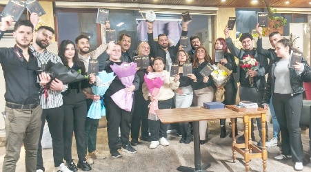 لم يخطر في بال الكاتب السوري الشاب كارلوس حنّا( 26 عاماً) المقيم في مدينة أربيل, الحضور الى أحدى المقاهي (الكافيهات) لدعوة أساتذته المونتير والمخرج الدكتور رؤوف ظاظا والدكتورة أيمان مارديني مديرا ( Art Academy ) الذي يدرس فيه التمثيل والتصوير والمونتاج وكتابة السيناريو, ويجد رفاق العمل والدراسة بأستقباله في باب المقهى محملين بالورود ويرقصون ويغنون له, وهو متفاجئ بما يقومون به حتى اصطحابة لأحدى الطاولات التي عليها عدد من الكتب بعنوان (المحاكمة) وهي روايته التي قدمها لأساتذته, لأنجازها فنيا يجدها أمام عينيه و يطلبون منه كتابة الأهداءات وهو بصدمة المفاجئة وبين الابتسامة والبكاء لهذا الموقف النبيل .