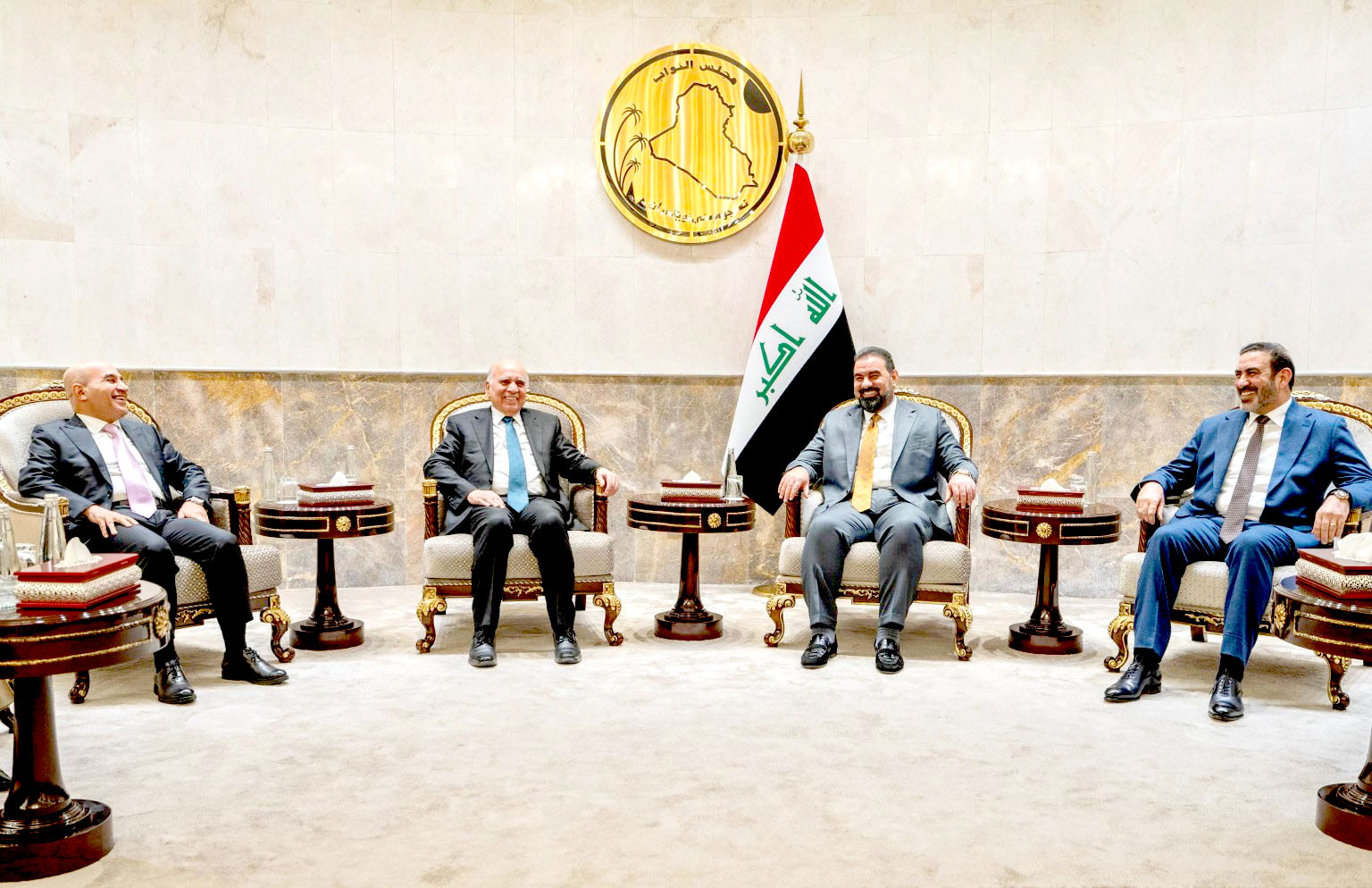وقال بيان أمس إن (الحلبوسي، استقبل بحضور وزير الصناعة والمعادن خالد بتال وعدد من نواب حزب تقدم، وفداً من الحزب الديمقراطي الكردستاني برئاسة وزير الخارجية فؤاد حسين)، وأشار إلى إن (اللقاء ناقش تطورات الأوضاع السياسية، وتأكيد استكمال الاستحقاقات ضمن المدد الدستورية المقرّرة). في وقت، ناقش رئيسا مجلس الوزراء محمد شياع السوداني والجمهورية عبد اللطيف جمال رشيد، تطورات الوضع السياسي والأمني والاقتصادي في البلاد، وتأكيد توحيد الصف الوطني، والعمل المشترك بين القوى للإسراع بتشكيل الحكومة القادمة ومواجهة التحديات الراهنة وتعزيز الاستقرار القائم، بما يلبي تطلعات المواطنين ويحقق المصلحة العليا للبلد. وقال بيان أمس إن (اللقاء بحث آخر المستجدات على الساحة السورية، وتأكيد أهمية خفض مستويات التوتر، والعمل على ترسيخ الأمن والاستقرار في مختلف أنحائها، وحماية حقوق جميع مكوّنات الشعب السوري، بما يحفظ وحدة سوريا وسيادتها، ويضمن سلامة مواطنيها).