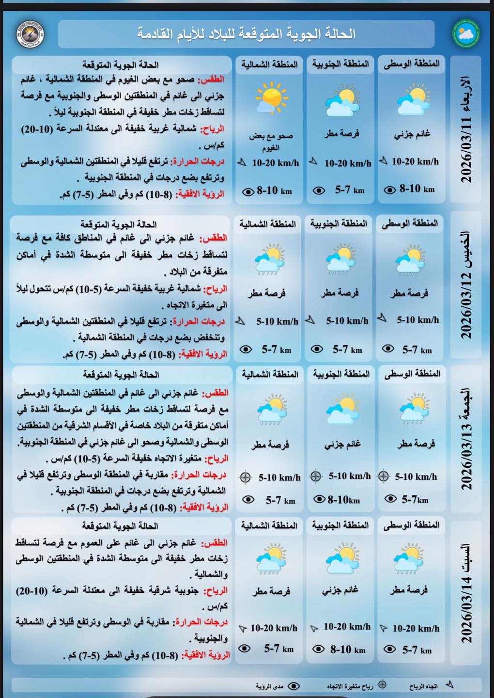 رجحت الهيئة العامة للأنواء الجوية والرصد الزلزالي التابعة لوزارة النقل، إن يكون طقس اليوم الأربعاء صحواً شمالاً وغائماً في الوسط والجنوب.