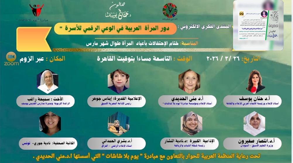 واستهلت أعمال المنتدى٬ بكلمة لرئيسة صالون المنتدى الفكري الالكتروني٬ حنان يوسف٬ بكلمة أكدت فيها ان (هذه الفعالية تمثل منصة مهمة للحوار الفكري وتبادل الخبرات بين النخب العربية)٬ مشددة على (ضرورة تمكين المرأة من أدوات التوجيه الرقمي داخل الأسرة، في ظل التحولات التكنولوجية المتسارعة التي يشهدها العالم)٬ من جانبها، أعربت الحديدي عن (سعادتها بالتفاعل الواسع مع المبادرة)٬ مشيرة إلى أن (التفاعل يعكس حاجة حقيقية في المجتمعات العربية٬ لإعادة تنظيم العلاقة مع التكنولوجيا، والحد من الاعتماد المفرط على الأجهزة الذكية، بما يسهم في استعادة التوازن الأسري وتعزيز التواصل الإنساني المباشر)٬ وشهد المنتدى (نقاشات موسعة بمشاركة نخبة من الشخصيات الفكرية والإعلامية من مختلف الدول العربية، من بينهم الإعلامية إيناس جوهر، سميحة راغب، نادية النشار، انتصار صغيرون، ومن العراق بشرى الحمداني، إلى جانب الكاتبة الصحفية نادية الجوري من تونس)٬ وتحدثن المشاركات عن (رؤى وأفكار حول سبل تعزيز الوعي الرقمي٬ وتمكين المرأة في الفضاء الإلكتروني)٬ وتميزت الأمسية بحضور شبابي لافت، عكس (أهمية إشراك هذه الفئة بوصفها الأكثر استخداماً وتأثراً بالتكنولوجيا، والأكثر قدرة على إعادة توجيهها نحو الاستخدام الواعي، عبر تنمية مهارات التفكير النقدي والابتعاد عن الاستهلاك غير المنضبط للمحتوى الرقمي)٬ ولفت المشاركون الى (أهمية التوسع في تبني مبادرات توعوية مثل يوم بلا شاشات)٬ داعين إلى (صياغة توصيات عملية تُرفع إلى صناع القرار، لاسيما وزارات التعليم والثقافة والإعلام، من أجل بناء سياسات متكاملة تعزز الوعي الرقمي بدءاً من المراحل المبكرة للتعليم، وصولاً إلى مختلف مؤسسات المجتمع). وجاء المنتدى برعاية (المنظمة العربية للحوار والتعاون الدولي، في توقيت يحمل دلالة رمزية، اذ تحوّل الاحتفاء بالمرأة من إطار الخطاب التقليدي إلى طرح تساؤل جوهري حول دورها كخط دفاع أول في ترسيخ وعي رقمي متوازن داخل الأسرة، في ظل تسارع التطور التقني واتساع الفجوة مع القدرة المجتمعية على مواكبتها). ويشهد العراق تحركاً حكومياً واكاديمياً٬ نحو تعزيز الوعي الرقمي وبناء ثقافة أمن سيبراني متقدمة، في ظل التحديات المتزايدة التي يفرضها الفضاء الإلكتروني، وما يرافقها من تهديدات تستهدف البيانات والأنظمة والمجتمع على حد سواء.