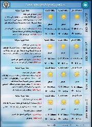 مؤكداً (استمرار تأثير الكتل الهوائية الباردة على البلاد خلال الأيام المقبلة). من جانبها، رجحت الهيئة العامة للأنواء الجوية والرصد الزلزالي التابعة لوزارة النقل، تصاعد الغبار وارتفاع درجات الحرارة. وقال بيان تلقته (الزمان) أمس عن (طقس اليوم الاثنين سيكون صحواً في عموم البلاد، والرياح تنشط، مسببة تصاعد غبار خفيف، ودرجات الحرارة تسجل في بغداد وديالى وواسط وكربلاء 40 والنجف وذي قار والديوانية وبابل والمثنى 41 وميسان والبصرة42 والأنبار وصلاح الدين 38 ودهوك 34 والسليمانية 32 وأربيل 36 ونينوى 37 درجة مئوية)، وأشار إلى إن (طقس يوم غد الثلاثاء سيكون صحواً في عموم البلاد، مع استمرار الغبار).