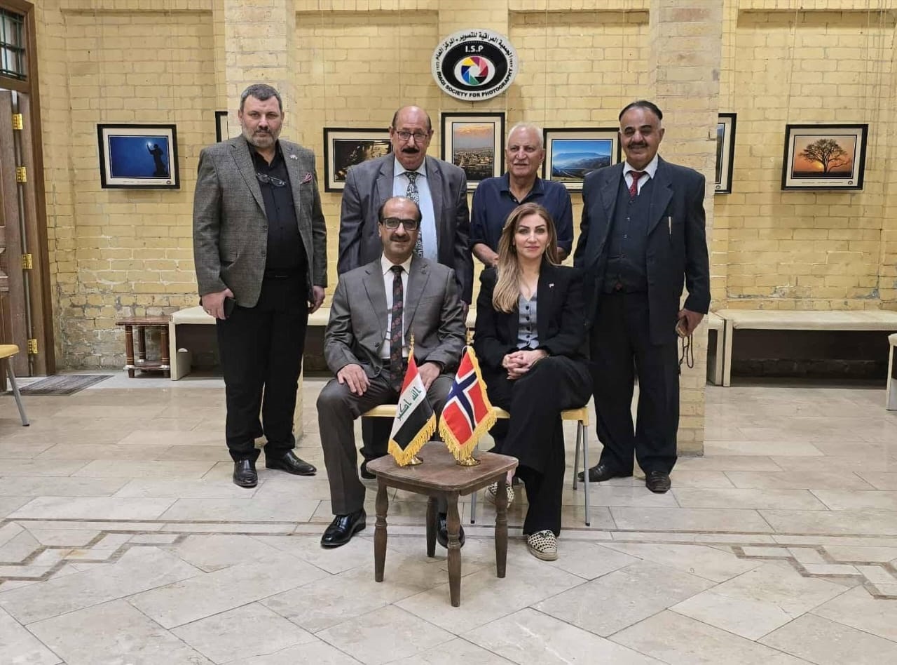 زار الجمعية العراقية للتصوير وفد المركز الثقافي النرويجي في العراق برئاسة رئيسة المركز جنة الربيعي رفقة رئيس مجلس الادارة رئيس تحرير التلفزيون النرويجي باللغة العربية (صوت النرويج) عضو الهيئة العامة للجمعية العراقية للتصوير المركز العام بغداد وسام كريم العزاوي في زيارة عمل اتسمت بالجدية في مجال التعاون بين العراق والنرويج.