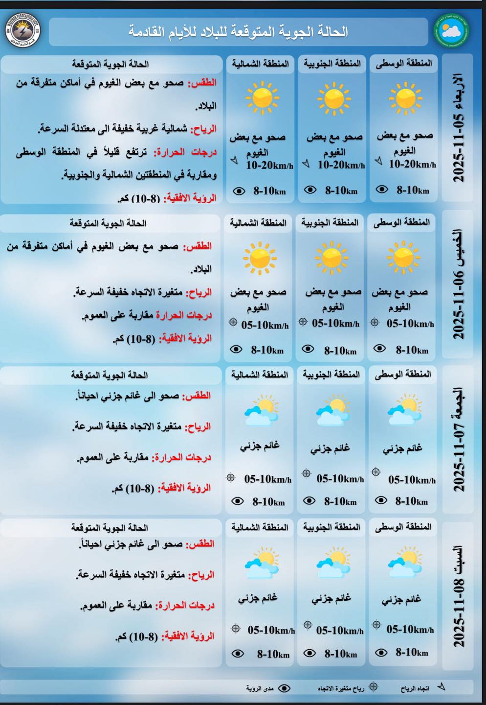 وتابع البيان إن (طقس يومي الجمعة والسبت المقبلين سيكون صحواً إلى غائم جزئيا، ولا تغير بدرجات الحرارة).