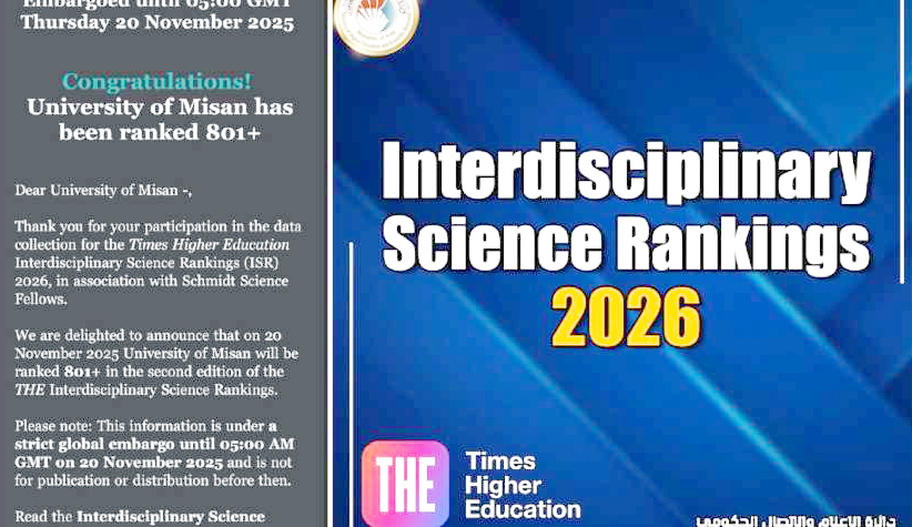 وقال مدير اعلام الجامعة٬ ليث الكعبي٬ لـ (الزمان) امس ان (جامعة ميسان حققت تفوقاً جديداً بدخولها للمرة الاولى تصنيف التايمز البريطاني٬ ضمن الفئة زائد 801، بحسب وزارة التعليم العالي والبحث العلمي٬ ضمن نتائج التصنيف 21026)٬ ونقل الكعبي عن رئيس الجامعة٬ عادل مانع الكعبي٬ بان (هذا الإنجاز يعد خطوة مهمة نحو تعزيز حضور جامعة ميسان ضمن خارطة الجامعات المؤثرة عالمياً، لا سيما في مجال الأبحاث العلمية متعددة التخصصات٬ التي تُعد أحد أهم المؤشرات المعتمدة في تصنيفات التايمز)٬ واضاف ان (اعتماد التصنيف العالمي تقييم 911 مؤسسة أكاديمية٬ وفق 11 مؤشراً للأداء موزعة بين ثلاثة مرتكزات رئيسة٬ وهي مدخلات التعليم والبحث٬ العمليات الأكاديمية ، والمخرجات البحثية والعلمية)٬ مبيناً ان (التصنيف شهد مشاركة  94 دولة حول العالم٬ جاء العراق ثانياً عربياً من حيث عدد الجامعات المشاركة، بتمثيل بلغ 29 جامعة حصلت على مواقع تنافسية مهمة، من بينها جامعة ميسان التي أثبتت حضورها الاول في هذا المحفل الدولي)٬ وأشار الكعبي الى ان (هذه النتيجة تاتي انعكاساً واضحاً للجهود الحثيثة التي تبذلها الجامعة في تطوير مناهجها، وتشجيع البحث العلمي والباحثين، فضلاً عن تعزيز البيئة الأكاديمية الملائمة للابتكار والإنتاج العلمي متعدد التخصصات).