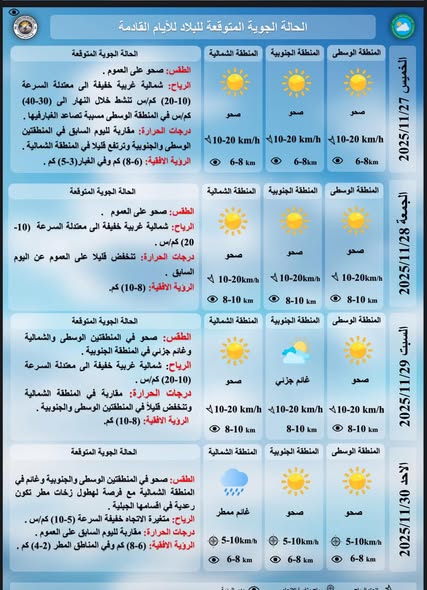 واستطرد بالقول إن (طقس يوم السبت المقبل سيكون صحواً في المنطقتين الوسطى والشمالية، وغائماً جزئياً في جنوباً، ولا تغير بدرجات الحرارة).