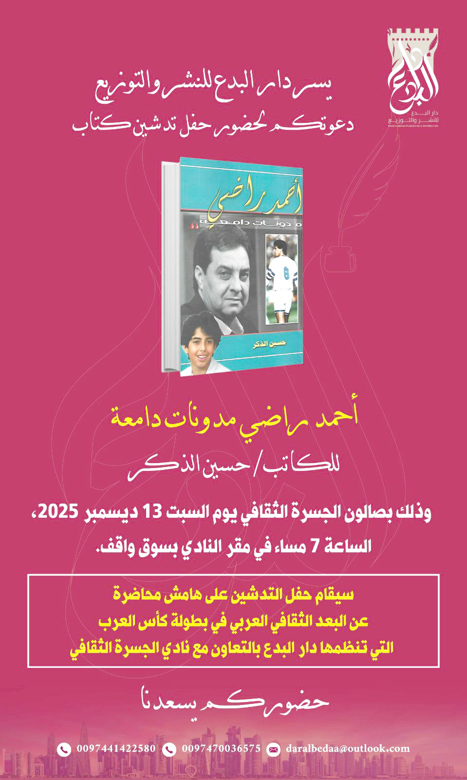 وجه صالون الجسرة الثقافي بقطر الدعوة لحضور أمسية ادبية رياضية ثقافية بعنوان البعد الثقافية العربي على هامش بطولة كأس العرب لكرة القدم المقامة حاليا في العاصمة القطرية الدوحة . ويلقي هذه المحاضرة الكاتب والإعلامي العراقي حسين الذكر والمدير العام لدار البدع للنشر والتوزيع القطربة الإعلامية نجاة علي وتدير الأمسية الأدببة حنان بديع. وعلى صعيد متصل تدشن دار البدع للنشر والتوزيع القطربة بادارة الإعلامية نجاة علي حفل توفيع كتاب (أحمد راضي مدونات دامعة ) للكاتب العراقي حسين الذكر وذلك بصالون الجسرة الثقافي يوم السبت 13 ديسمبر 2025 وسيقام حفل تدشين الكتاب على هامش محاضرة البعد الثقافي العربي في بطولة كأس العرب التي تنظمها دار البدع بالتعاون مع نادي الجسرة الثقافي الثقافي يوم السبت المقبل بمقر النادي والدعوة للحميع للحضور .