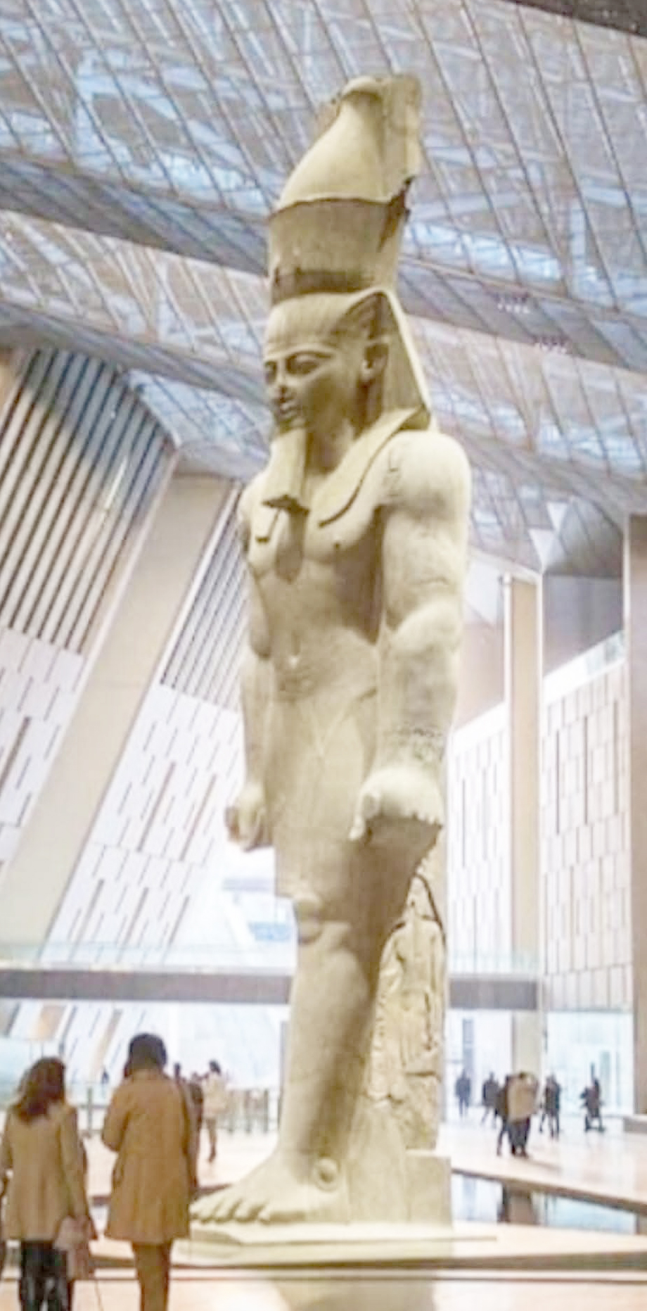 ولمعرفة حكاية المتحف والمراحل الزمنية لنشأته، ومكوناته الآثارية والحضارية والثقافية، كان لا بد لي تفقدهُ وزيارتهُ، لأكون في قلب أحداثِهِ، وبعد زيارتي للمرة الثانية من الإسكندرية إلى القاهرة، وهذه المرة كانت الزيارة من خلال الباص السياحي الذي أمضى بيَّ نحو الطريق الصحراوي، الذي يبعُد عن القاهرة حوالي 250 كيلو متراً وأستغرقت الرحلة ساعتان ونصف الساعة، ترجلتُ من الباص في محطة وقوف وأستراحة بالقرب من ساحة التحرير، ومن هناك أستقليتُ مركبةَ اُجرة أوصلتني إلى الجهة الشمالية لميدان التحرير وسط البلد، الذي يقع فيه المتحف، وحال ترجُلي من المركبة فإذا أمامي مباشرةً الواجهة الأمامية المُهيبةَ للمتحف (حائط الأهرامات) الذي يبلُغ عُرضهُ حوالي 600 متر، ويصل أرتفاعهُ 45 متراً، ثُمَ دلفتُ إلى داخل مبنى المتحف الذي يتألف من كتلتينِ رئيسيتين هما، إلى يسارهِ (جهة الجنوب)، بمساحة أجمالية تقدر بأكثر من 92 متر مربع، ومبنىً المؤتمرات إلى يمينهِ جهة الشمال وبمساحة أجمالية تصل إلى أربعين متر مربع، ويربط بين الكتلتين، بهو المدخل إذ يقبع فيهِ تمثال رمسيس العظيم، وحينما كنتُ أتجول في مرافق المتحف، شاهدتُ مجموعة من زوار المتحف يتوسطهم مرشدٌ سياحيٌ آثاريٌ من مصلحة الآثار والمتاحف، يتحدث عن تاريخ ومراحل إنشاء المتحف وأهميتهُ التأريخية والحضارية لمصر، أنضميتُ للمجموعة، ودونتُ ما قالهُ المرشد عن قصة المتحف موضحاً :