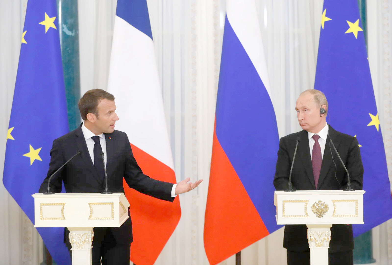 وأعلن الرئيس الروسي فلاديمير بوتين بأنه مستعدّ لإجراء حوار مع الرئيس الفرنسي ايمانويل ماكرون، ردّا على تصريحات مماثلة أدلى بها الرئيس الفرنسي.