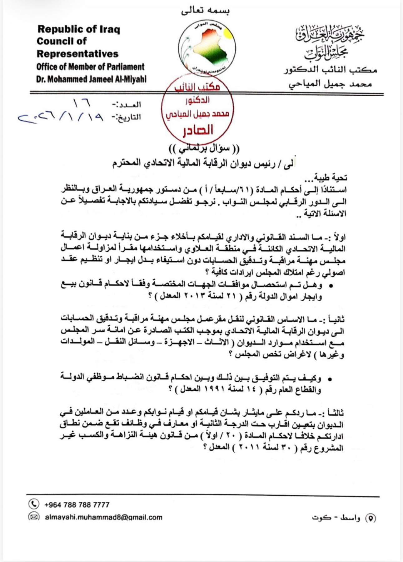 وجّه البرلمان سؤالا رسميًا إلى ديوان الرقابة المالية الاتحادي، للمطالبة بالكشف عن تجاوزات مخالفات تخص عمل ديوان الرقابة. واطلعت (الزمان) أمس على وثائق مذيلة بتوقيع النائب محمد جميل المياحي جاء فيها إن (هناك توسعًا غير مبرر في الإنفاق والإيفادات الخارجية خلال السنتين الماضيتين في ديوان الرقابة دون الحصول على موافقة رئاسة مجلس النواب، في مخالفة صريحة للمادة 103 من الدستور، التي تنص على استقلالية ديوان الرقابة المالية وارتباطه بالبرلمان حصراً)، مطالباً (بتقديم كشف تفصيلي بالكلفة المالية الإجمالية لهذه الإيفادات وجدواها العملية والنتائج المتحققة منها، في ظل الأوضاع الاقتصادية الحساسة التي يمر بها العراق، وضرورة ترشيد الإنفاق وحماية المال العام)، وشدد المياحي على (ضرورة توضيح الإجراءات المتخذة لمنع استغلال المنصب الوظيفي أو الموارد العامة، وتعزيز مبادئ النزاهة والشفافية، وترسيخ المساءلة داخل مؤسسات الدولة)، مؤكدًا إن (أي تقصير أو تجاوز يجب أن يُحال إلى الجهات القضائية المختصة دون تهاون)، وتساءل المياحي (ما الأساس القانوني لنقل مقر مجلس مهنة مراقبة وتدقيق الحسابات الى ديوانكم، مع استخدام الأثاث والأجهزة ووسائل النقل لأغراض المجلس، وما هو جوابكم عن ما يثار بشأن قيام نوابكم وعدد من العاملين بتعيين أقارب او معارف في وظائف تقع ضمن نطاق ادارتكم)،وتابع إن (الرقابة البرلمانية ستُمارس بكل حزم، وأن مجلس النواب لن يقف مكتوف الأيدي أمام أي تصرف يمس المال العام أو يخالف الدستور)، داعيًا إلى (إجابات تحريرية واضحة ومعللة، واتخاذ الإجراءات الرقابية اللاحقة، بما في ذلك الإحالة إلى القضاء عند الاقتضاء).