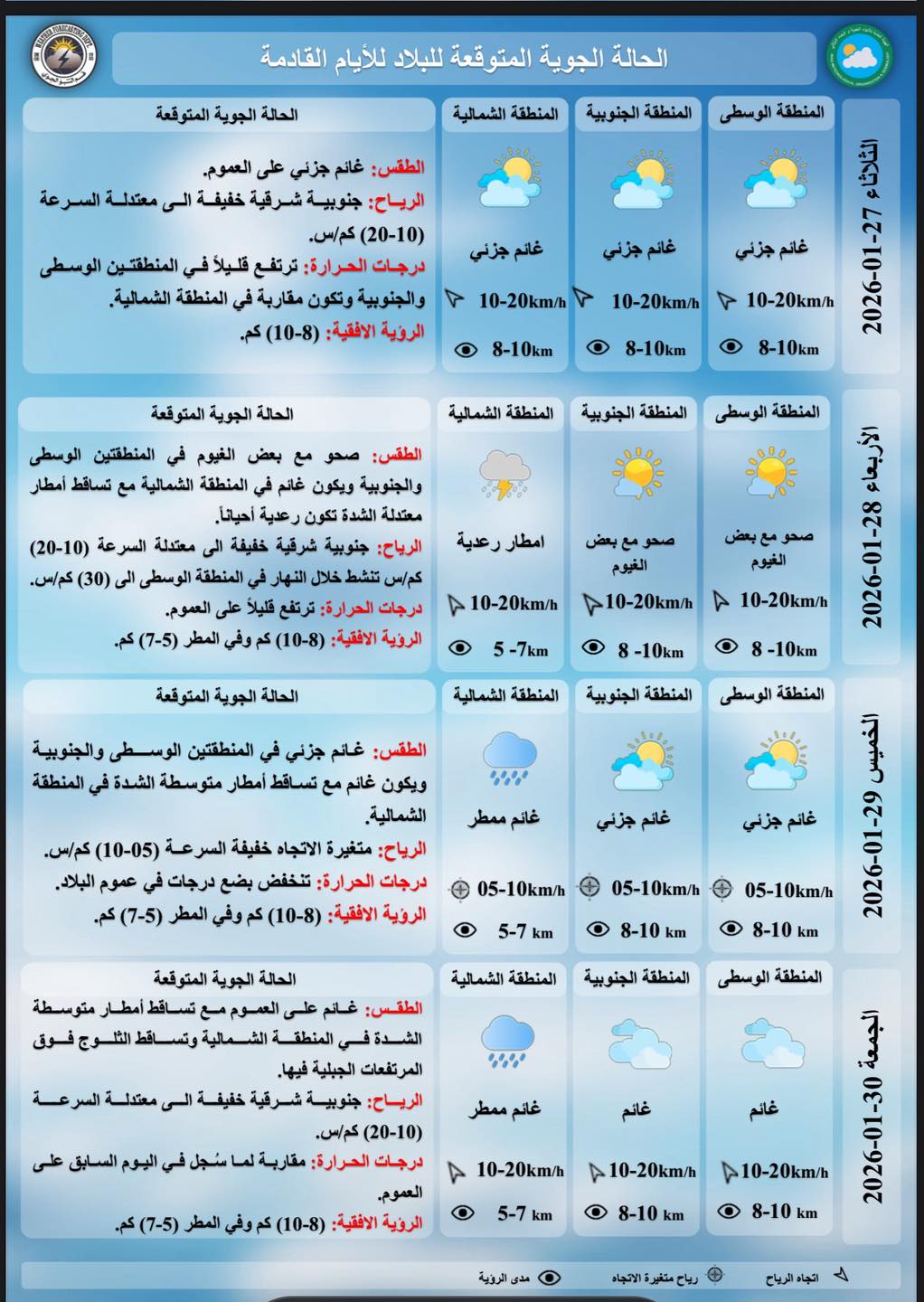 رجحت الهيئة العامة للأنواء الجوية والرصد الزلزالي التابعة لوزارة النقل، إن يكون طقس اليوم الثلاثاء غائماً ممطراً. وقال بيان تلقته (الزمان) أمس إن (طقس اليوم الثلاثاء سيكون غائماً جزئياً، ودرجات الحرارة ترتفع قليلاً في المنطقتين الوسطى والجنوبية ومقاربة لليوم السابق شمالاً)، وأضاف إن (درجات الحرارة العظمى تسجل في السليمانية ودهوك 13 وكركوك ونينوى وأربيل 15 وصلاح الدين والأنبار 17 وديالى 18 وبغداد وكربلاء والنجف والديوانية 19 وواسط وميسان وذي قار والمثنى وبابل والبصرة 20 درجة مئوية)، وأشار البيان إلى إن (طقس يوم غد الأربعاء سيكون صحواً مع بعض الغيوم في المنطقتين الوسطى والجنوبية وغائماً شمالاً مع تساقط أمطار معتدلة الشدة تكون رعدية أحياناً)، وتابع البيان إن (طقس يوم الخميس المقبل سيكون غائماً جزئياً في المنطقتين الوسطى والجنوبية وغائماً مع تساقط أمطار متوسطة الشدة شمالاً). وتسببت عاصفة ثلجية اجتاحت الولايات المتحدة في انقطاع الكهرباء عن أكثر من 700 ألف منزل، لا سيما في ولايات تينيسي وتكساس ومسيسيبي ولويزيانا الأكثر تضررًا. كما أدت إلى إلغاء أكثر من 13 الف و500 رحلة جوية في جميع أنحاء البلاد، بما في ذلك نحو 10 آلاف رحلة كانت مقررة. وبحسب هيئة الأرصاد الجوية الوطنية، فإن (نحو 180 مليون شخص تأثر بالعواصف الثلجية والأمطار المتجمدة).