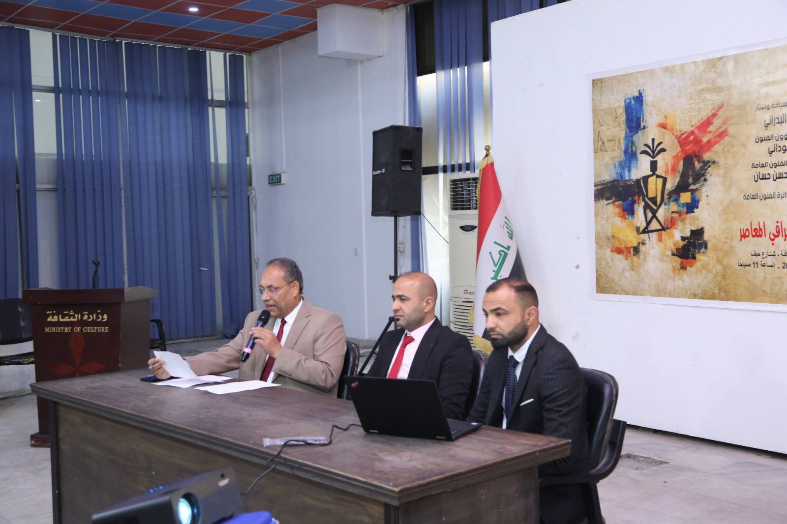 (الفن العراقي المعاصر: آفاقه وتطوره) هو عنوان ندوة تخصصية اقامها قسم الثقافة الفنية بدائرة الفنون العامة ضمن برامجها الثقافية الرامية إلى دعم الحركة التشكيلية وتعزيز حضورها في المشهد الثقافي الوطني.وشهدت الندوة تقديم محاضرة مشتركة للفنانين طيف محمد نجم وسرمد محمد نجم فيما أدار الجلسة الدكتور قاسم بلشان بحضور نخبة من الفنانين والأكاديميين والمهتمين بالشأن التشكيلي. واستعرض المحاضران مسيرة الفن التشكيلي العراقي المعاصر، متتبعين جذوره المتصلة بالإرث الحضاري العريق لبلاد الرافدين، ومسلطين الضوء على أبرز منجزاته منذ خمسينيات القرن الماضي، لاسيما تجارب الرواد الذين عملوا على نقل وتأصيل التجربة الفنية الأوروبية ضمن سياق محلي، وأسهموا في بلورة هوية فنية عراقية ذات خصوصية واضحة.كما تناولت الدور الريادي لعدد من أعلام الفن العراقي، من بينهم جواد سليم، وفائق حسن، وخالد الرحال، ومحمد غني حكمت، وكاظم حيدر، وإسماعيل فتاح الترك، الذين شكلت أعمالهم منعطفات مهمة في ترسيخ دعائم الحركة التشكيلية في العراق، وفتح آفاق جديدة أمام الأجيال اللاحقة.