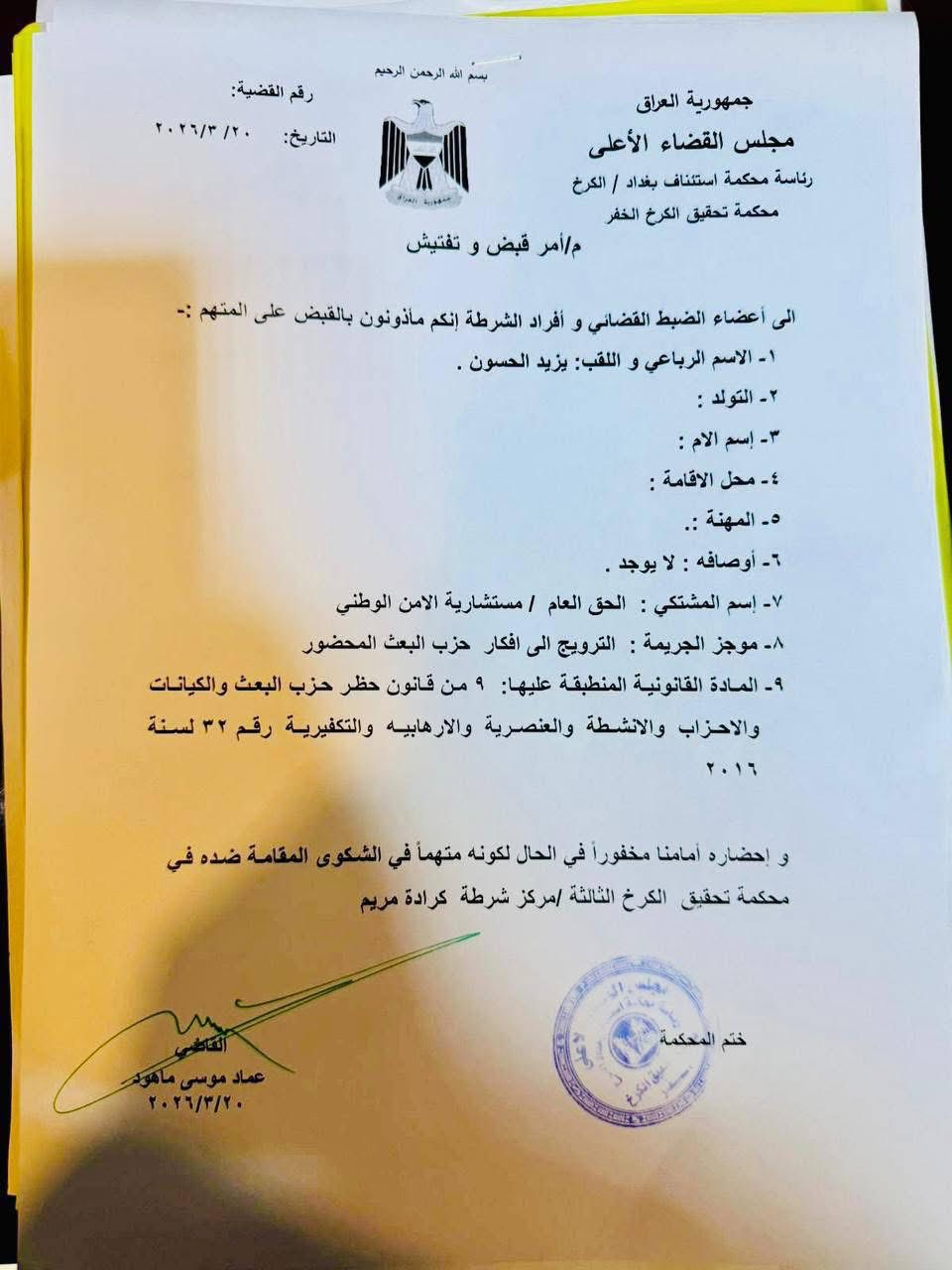 أصدر القضاء، مذكرة قبض بحق متهم، قام بنشر محتوى مسيئاً لشهداء العراق، أثار موجة استياء واسعة في الأوساط الشعبية. وقال رئيس خلية الإعلام الأمني الفريق سعد معن في بيان أمس إنه (تم إصدار مذكرة قبض بحق المدعو يزيد الحسون، وذلك على خلفية إساءته لشهداء العراق عبر محتوى منشور أثار موجة استياء واسعة في الأوساط الشعبية). وأضاف إن (مذكرة القبض جاءت استناداً إلى ما تضمنه المحتوى من عبارات مسيئة استفزازية تمس رمزية الشهداء، فضلاً عن تحريضه على إثارة الفتنة وزعزعة السلم المجتمعي بين أبناء الشعب). وأكد إن (حرية التعبير مكفولة ضمن الأطر القانونية، إلا أن التجاوز على الثوابت الوطنية والإساءة إلى تضحيات الشهداء يُعدّ انتهاكاً يعاقب عليه القانون). وشدد على (استمرار الجهات المعنية باتخاذ الإجراءات الرادعة بحق كل من يحاول المساس بأمن واستقرار المجتمع)، داعياً المواطنين إلى (الالتزام بالقانون وتجنب نشر أو تداول أي محتوى من شأنه تأجيج الفتنة أو الإساءة للرموز الوطنية). وكان مستشار الأمن القومي قاسم الأعرجي، قد أكد إن الملاحقة القانونية ستشمل كل من يثبت تورطه في التحريض على الفتنة وإثارة الانقسام بين العراقيين. وكتب الأعرجي، تدوينة له على منصة إكس تابعتها (الزمان) إن (على الجهات التي تمول وتحرض على الفتنة وإثارة الانقسام بين العراقيين، التوقف فوراً عن جميع أشكال التمويل والتحريض والترويج للفتن، فهذه الأفعال تمثل انتهاكاً صريحاً لوحدة العراق وأمنه الوطني). وأضاف إن (الملاحقة القانونية ستشمل كل من يثبت تورطه في هذه الأفعال، وسيخضع لعقوبات صارمة وفقاً للقانون العراقي).