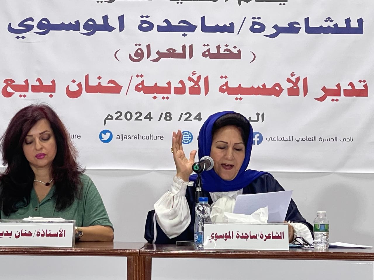 أقام نادي الجسرة الثقافي في الدوحة عاصمة دولة قطر مساء السبت الماضي أمسية ثقافية مميزة للشاعرة العراقية ساجدة الموسوي استهلتها بتوطئة وقصيدة للدوحة ثم قرأت العديد من القصائد عن العراق كانت مليئة بالعاطفة والشجن ومما حلَّ فيه من دمار وخراب بعد الاحتلال الغاشم ومن تلك القصائد (وداع- مكالمة- لا تسأل كيف الحال- لماذا بلادي تدمر- قصيدة البحر وغير ذلك) كما قرأت عن طفل وزوج وشيخ من ضحايا العدوان على غزة.